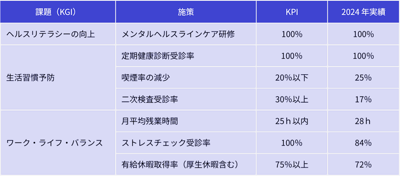 健康診断受診率 100%を毎年達成するために健康診断の受診日を事務局が調整し、毎月ごとに受診状況の点検を行う。また、健康診断の結果に基づき再検査や精密検査の受診勧奨及び一部費用負担をおこなっています